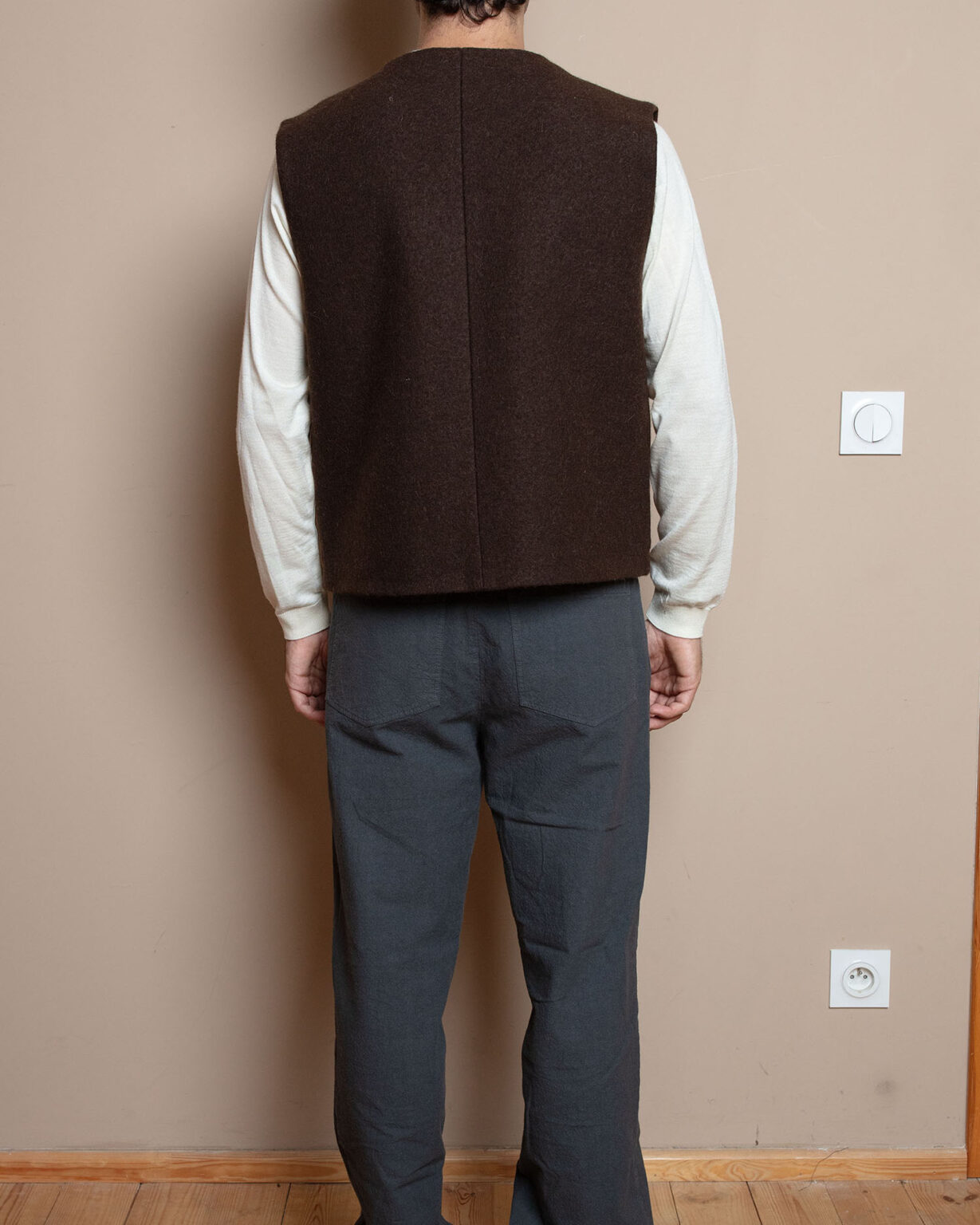 . Design : Col rond, poches plaquées, boutons corozo, entièrement doublé