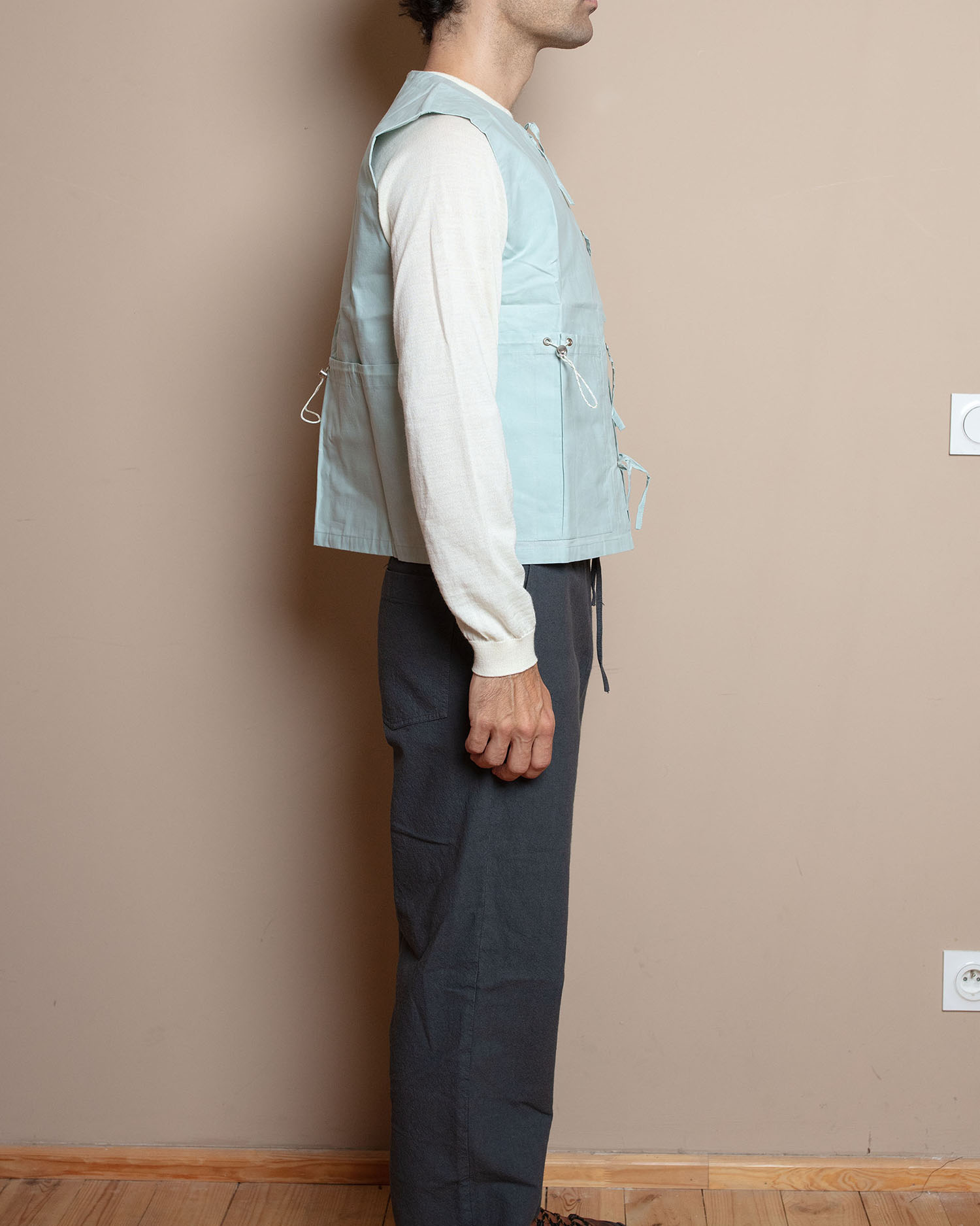 . Design : Col rond, poches plaquées à soufflet, poche « fourre-tout » arrière, fermeture à liens