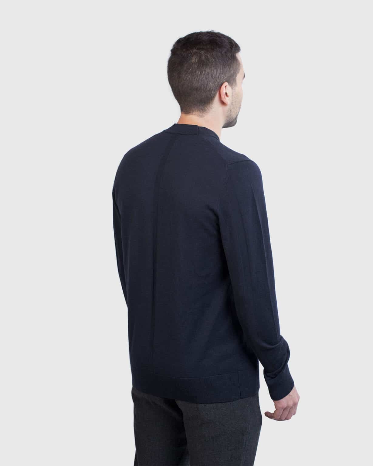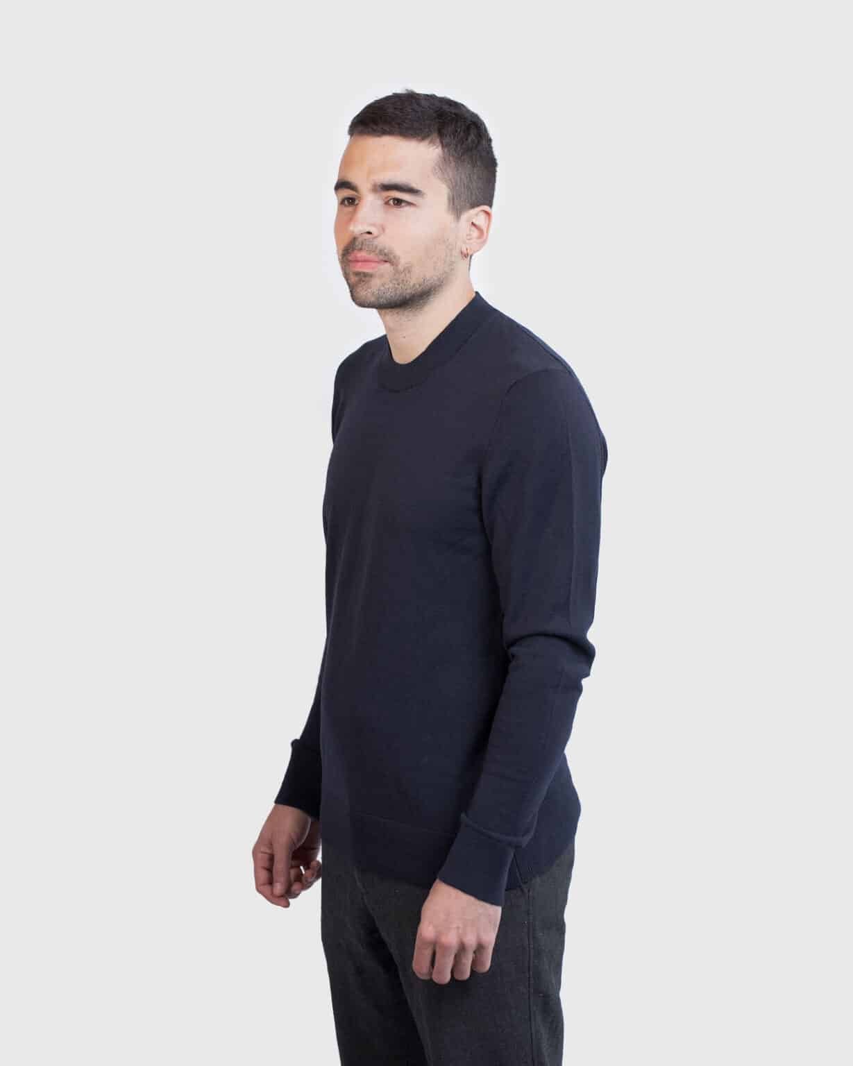 . Design : Col rond, fully fashionned, entièrement remaillé . Matière : Laine Mérinos d’Arles Peignée (France) . Coupe : Port ajusté, proche du corps
